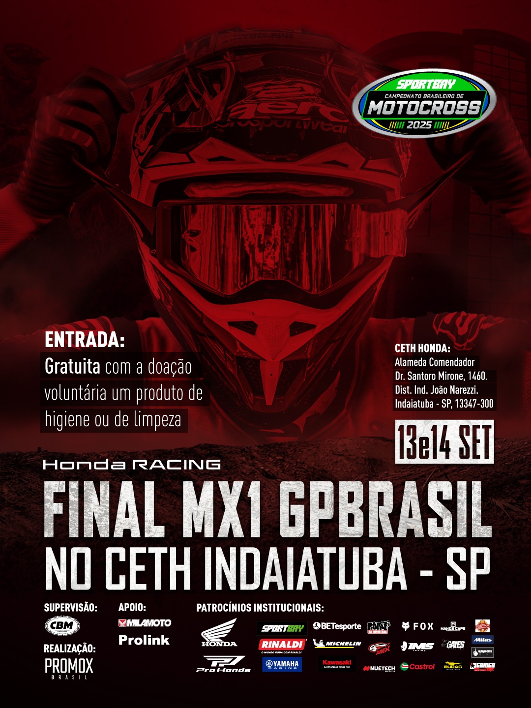 O coração do motocross brasileiro já bate mais forte. Nos dias 13 e 14 de setembro, a cidade de Indaiatuba/SP será palco da Super Final do MX1 GP Brasil Sportbay, um dos eventos mais aguardados do calendário esportivo nacional. A etapa decisiva promete reunir milhares de fãs, que poderão acompanhar de perto a emoção da disputa pelos títulos e o talento dos maiores pilotos do país.